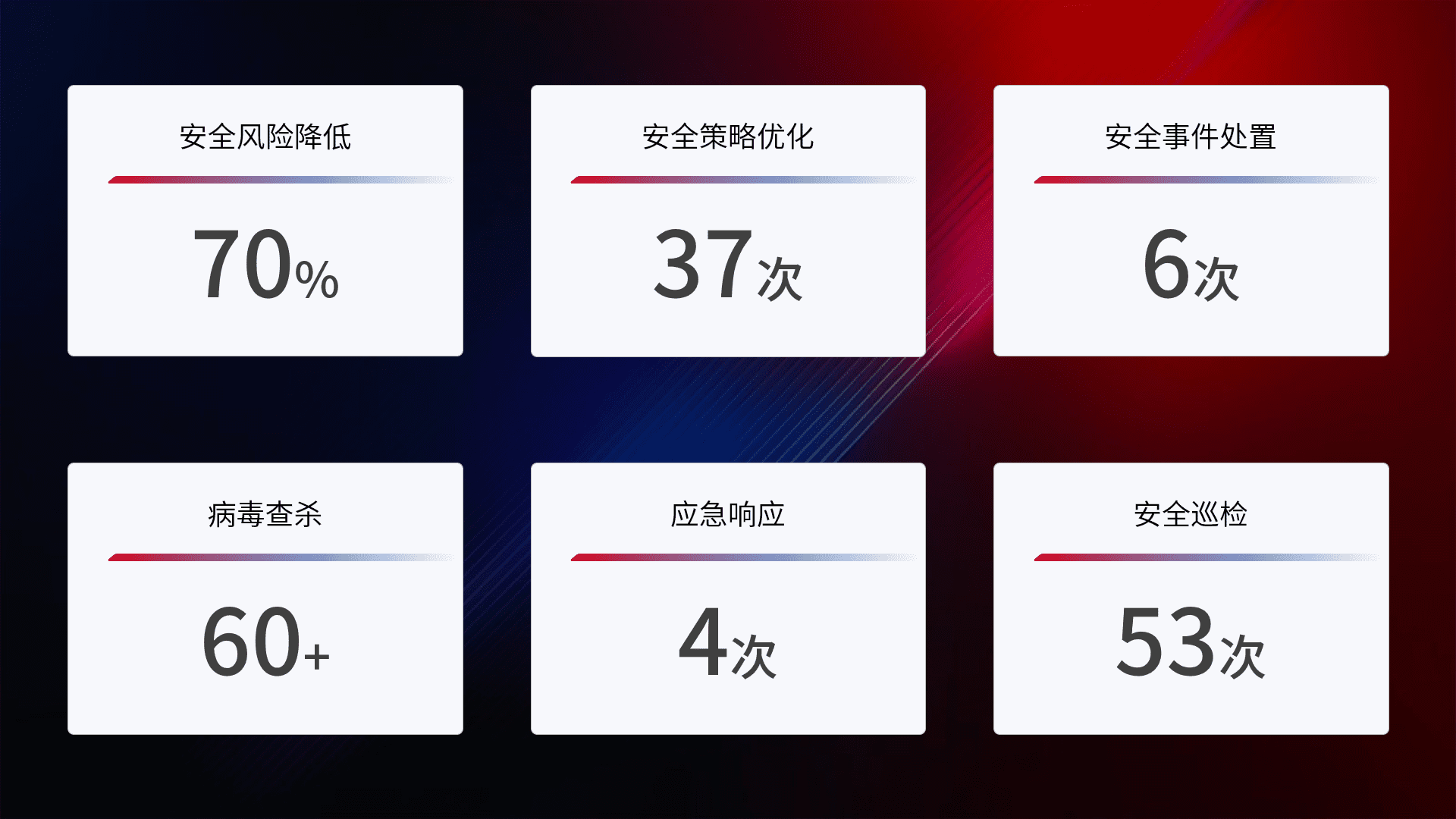 提供全面的安全事件报告体系,,,包括处置报告、、、周报、、、、季度和年度总结,,,,结合持续监控,,,帮助客户深入了解网络安全状况。。。。